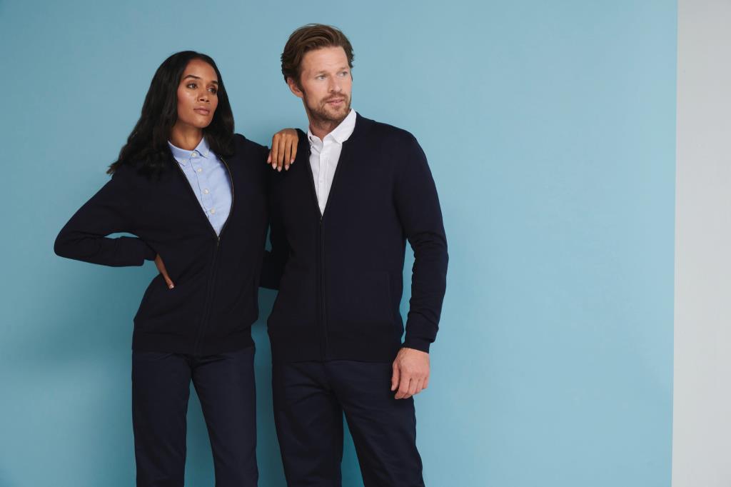 50% coton / 50% acrylique. Cardigan unisexe à col bomber à maille fine de jauge 12. Manches semi-façonnées. Fermeture zippée devant avec glissière et tirette métalliques. Bord-côte 1x1 col, bas de manche et bas de vêtement. Poches avant passepoilées.
