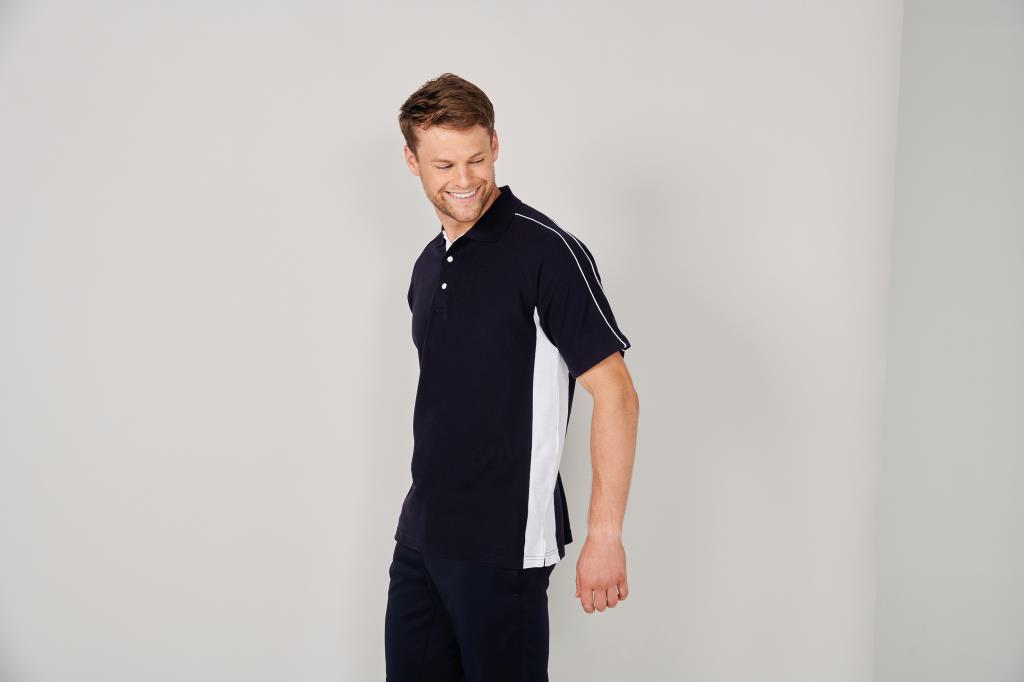 100% coton micropiqué. Col en bord côte. Patte de boutonnage contrastés et 3 boutons. Bandes contrastées sur les côtés. Passepoil contrasté sur les manches. Fentes latérales en couleur contrasté.
