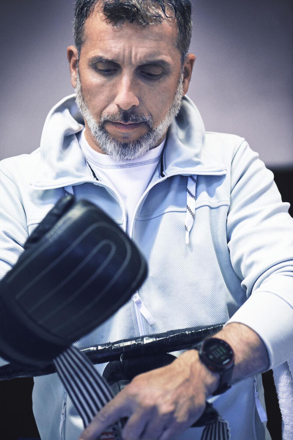 Sweat sportif homme en polyester avec fermeture complète sur le devant et une fermeture décorative au col. Cordons bicolores sur le devant et bande de propreté contrastante.