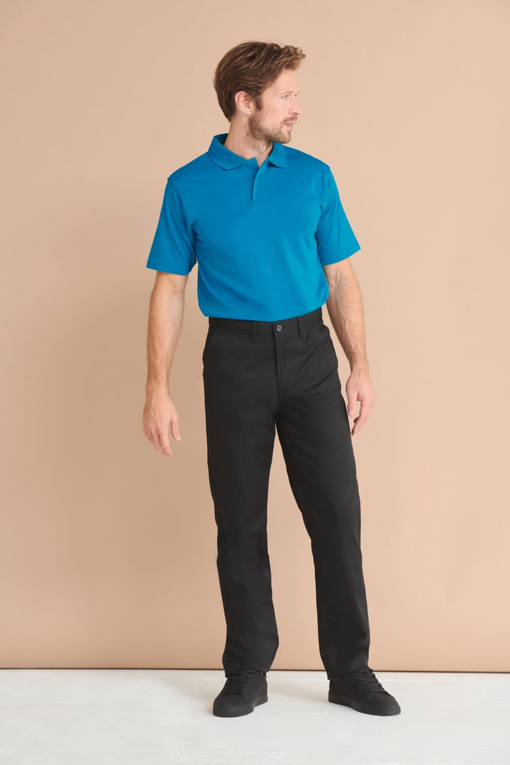 65% polyester / 35% coton. Pantalon coupe droite. 2 poches arrière avec bouton, poches côtés et poche ticket. Passants à la ceinture.
