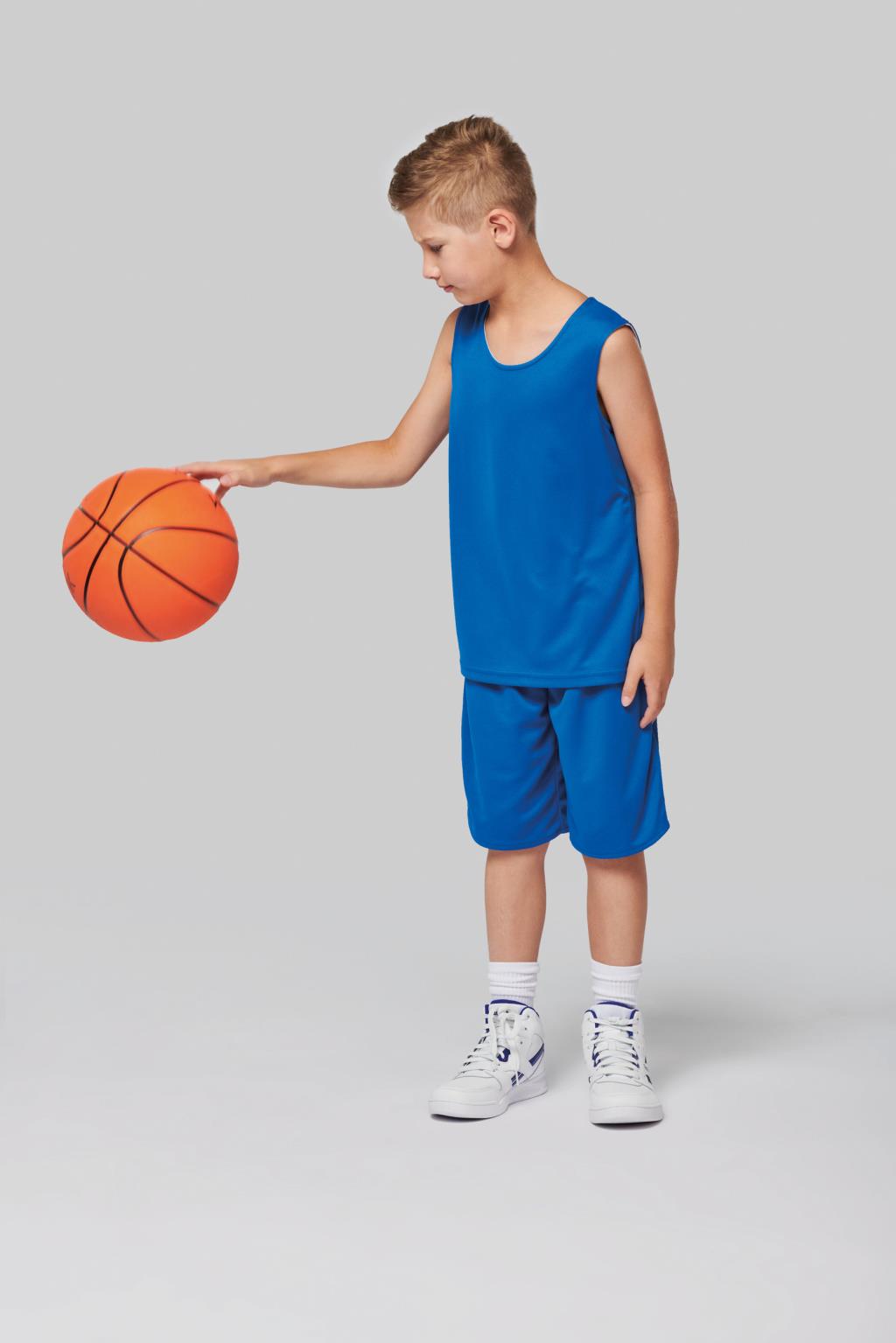 100% polyester. Tissu doublé et réversible. Ensemble unisexe composé d'un maillot sans manche et d'un short. Maillot : réversible et composé de 2 couches cousues de 150 g/m² chacune. Bas de vêtement non assemblé pour faciliter la personnalisation. Short : réversible et composé de 2 couches cousues de 150 g/m² chacune. Ceinture élastiquée avec cordon de serrage.